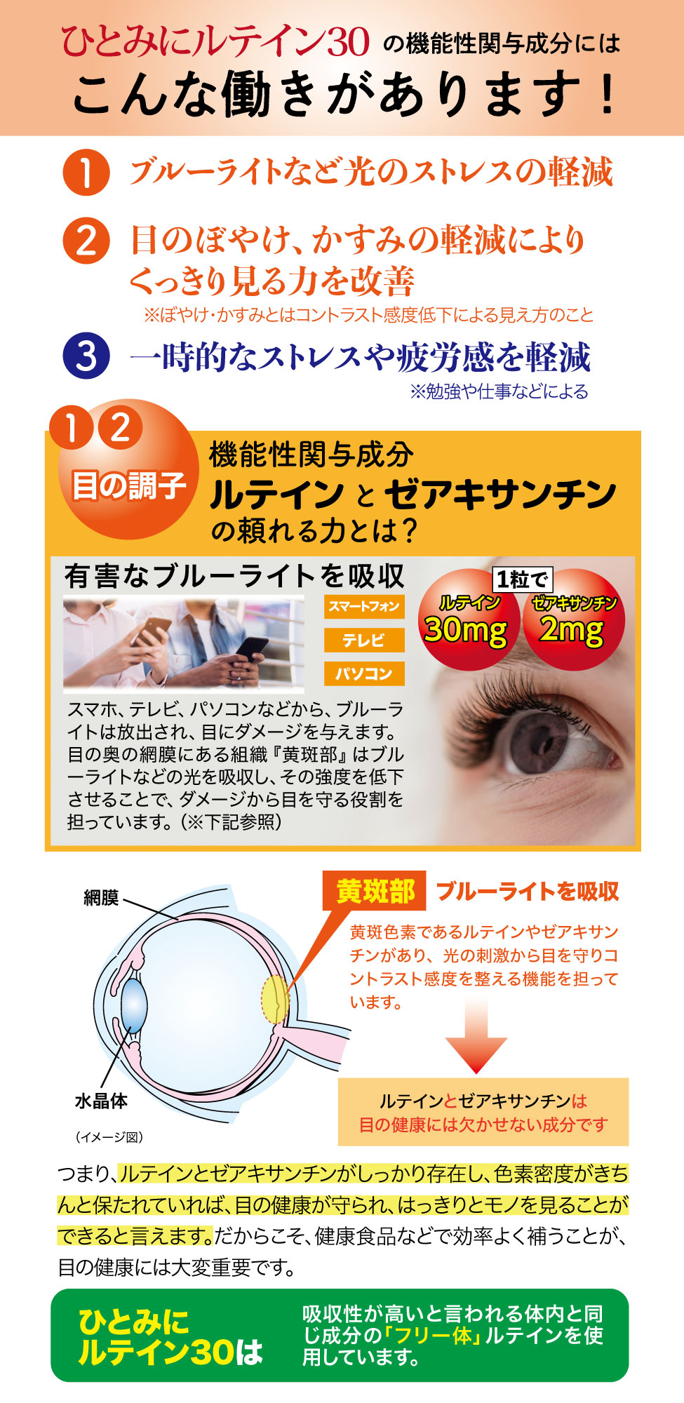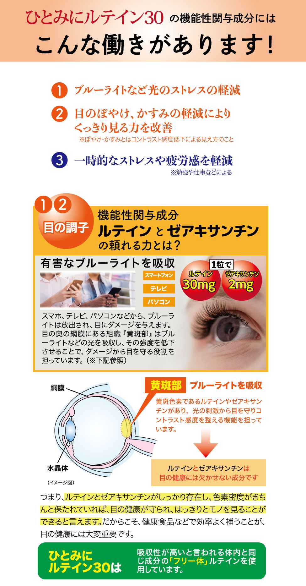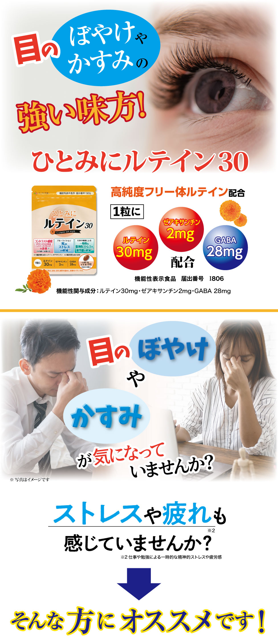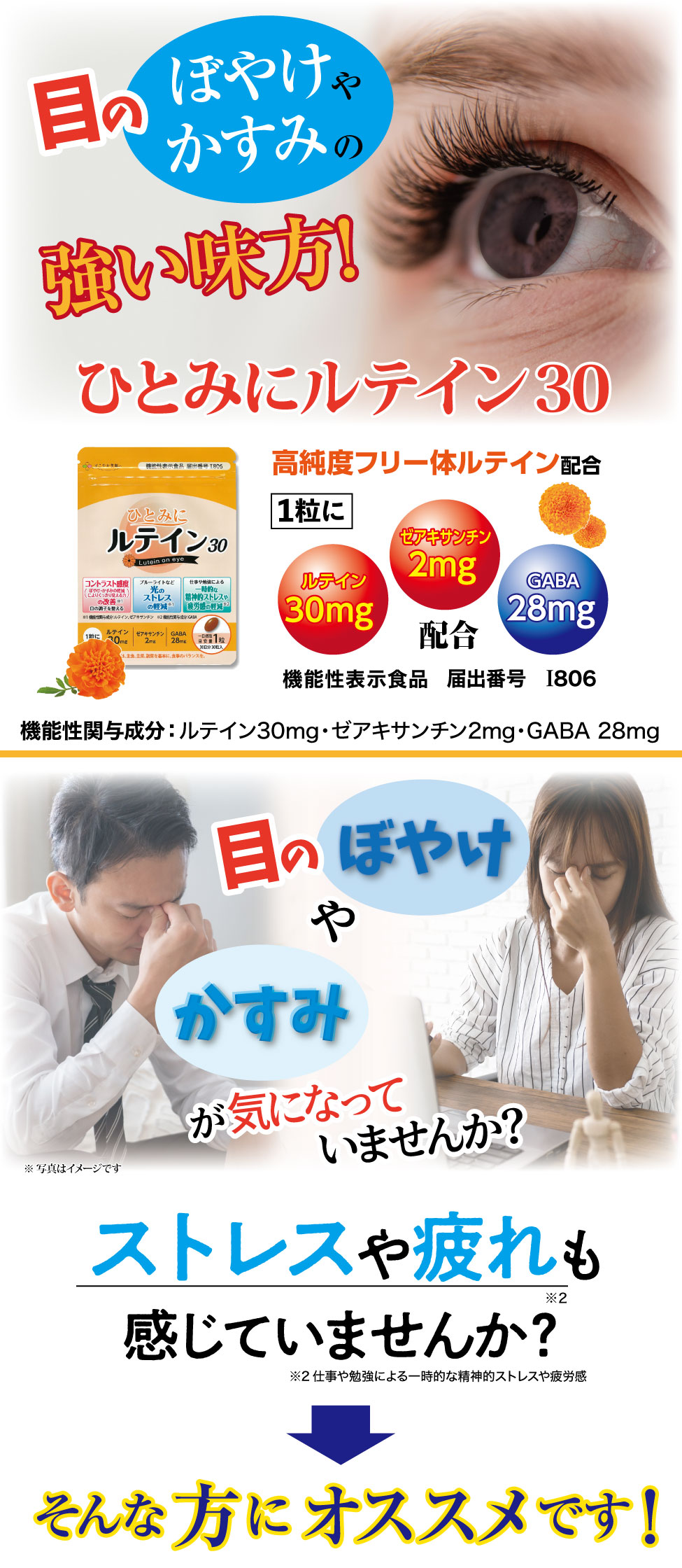 届出表示: 本品にはルテイン、ゼアキサンチンとGABAが含まれます。ルテイン、ゼアキサンチンには、目の黄斑部の色素密度の増加によるブルーライトなどの光のストレスの軽減、コントラスト感度(ぼやけ・かすみの軽減によりくっきり見る力)を改善し、目の調子を整えることが報告されています。GABAには、仕事や勉強による一時的な精神的ストレスや疲労感を軽減する機能があることが報告されています。