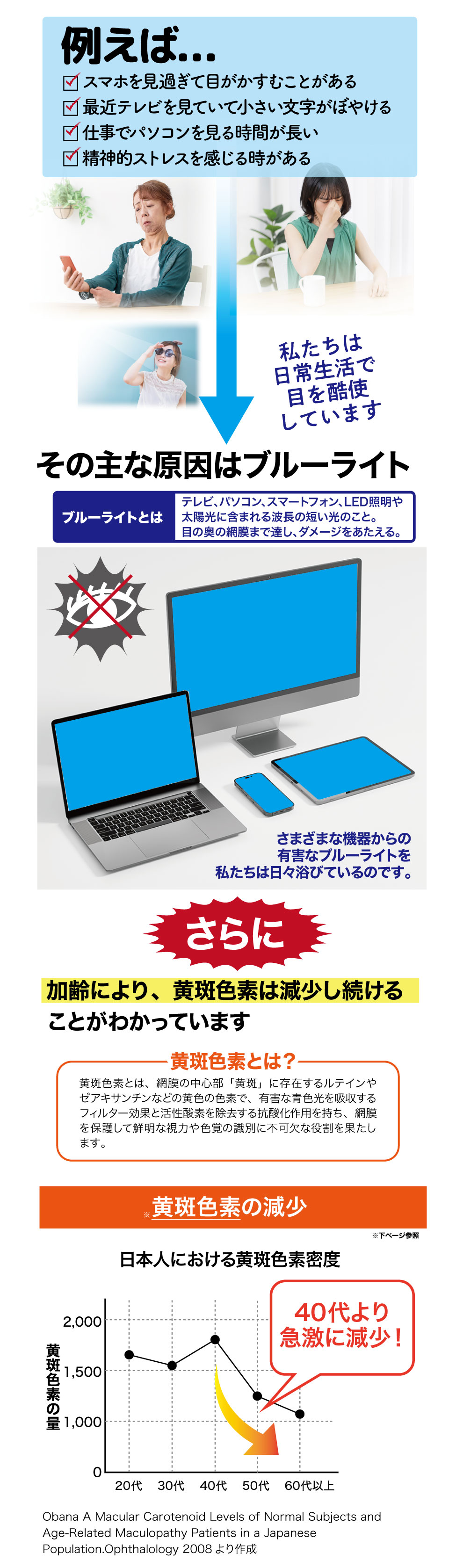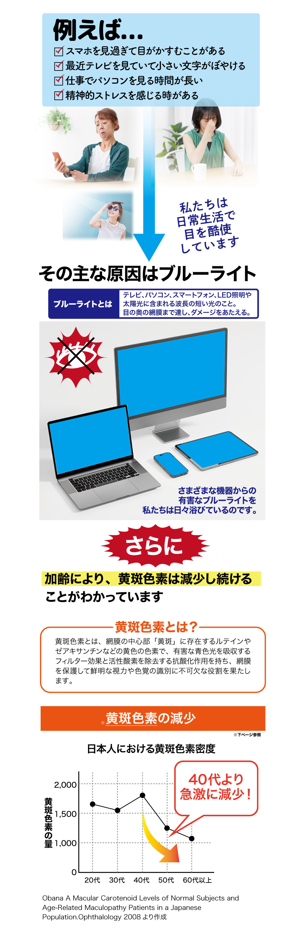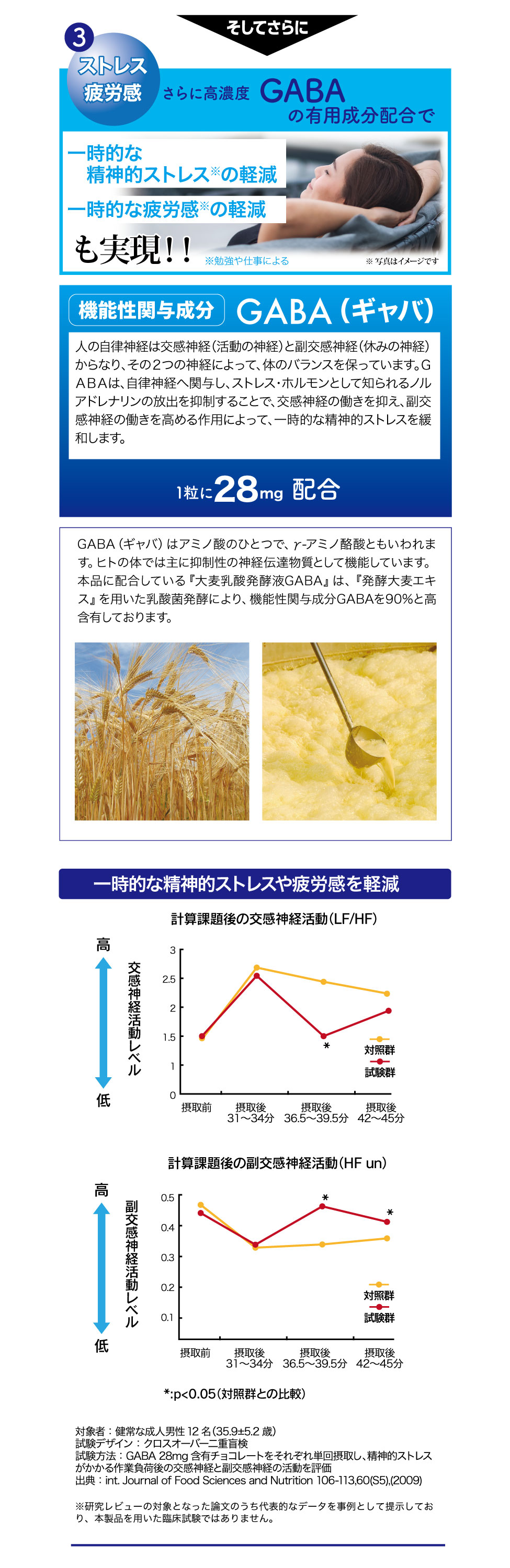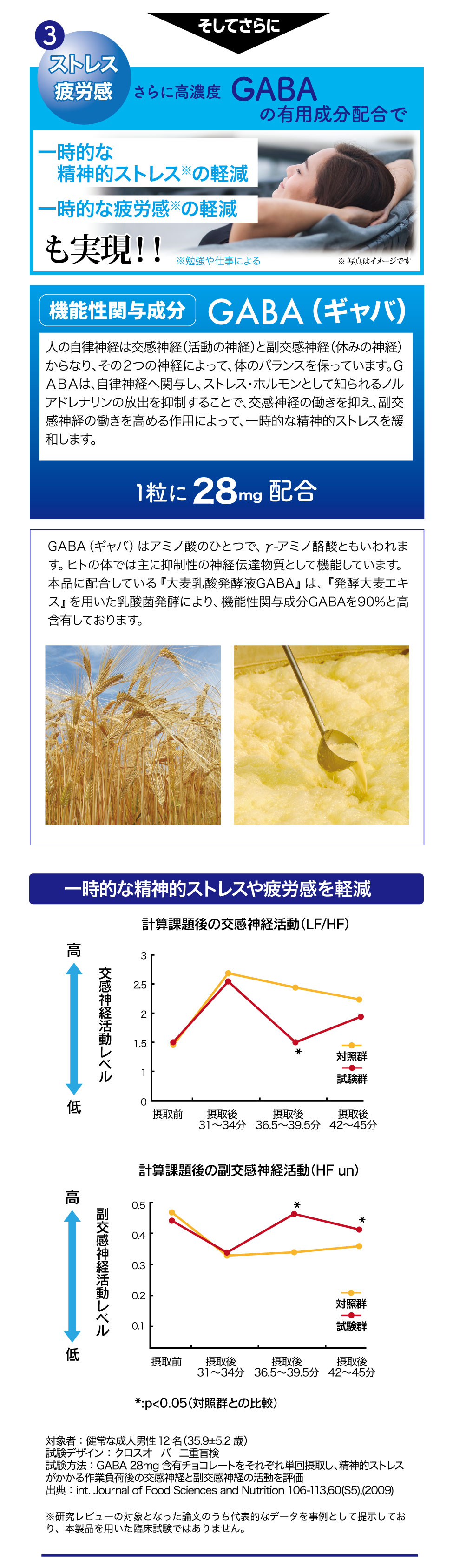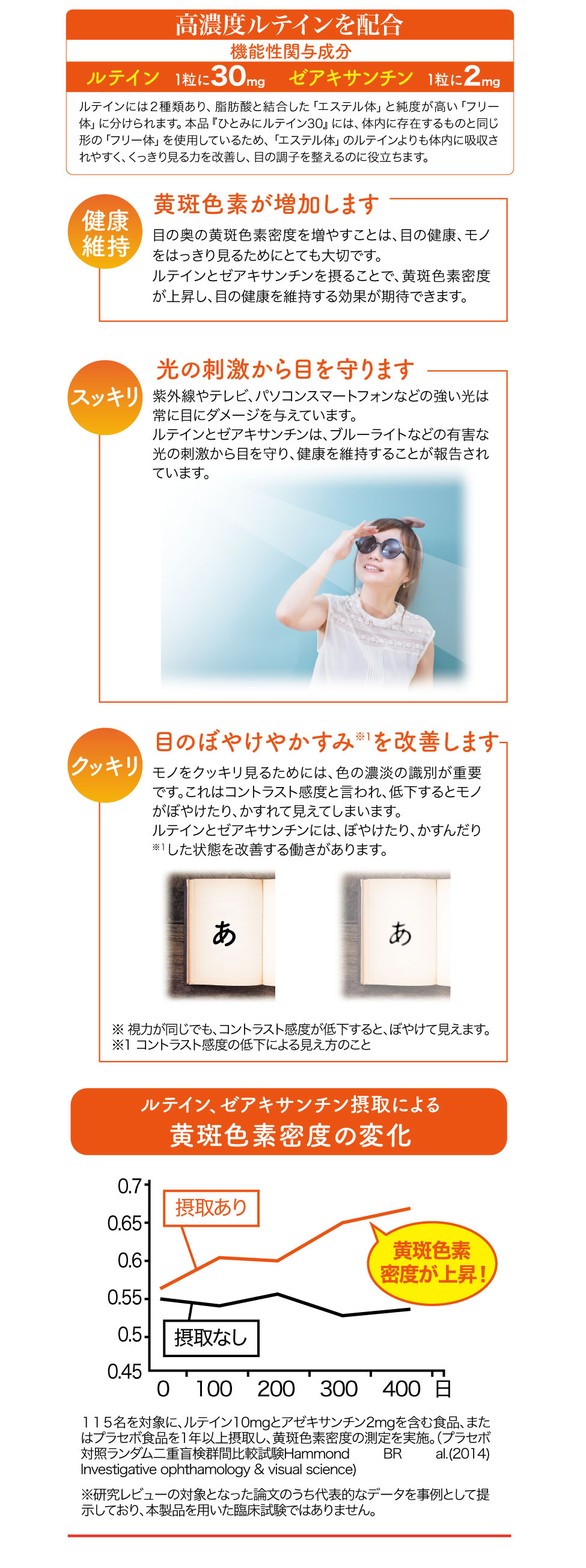 届出表示: 本品にはルテイン、ゼアキサンチンとGABAが含まれます。ルテイン、ゼアキサンチンには、目の黄斑部の色素密度の増加によるブルーライトなどの光のストレスの軽減、コントラスト感度(ぼやけ・かすみの軽減によりくっきり見る力)を改善し、目の調子を整えることが報告されています。GABAには、仕事や勉強による一時的な精神的ストレスや疲労感を軽減する機能があることが報告されています。