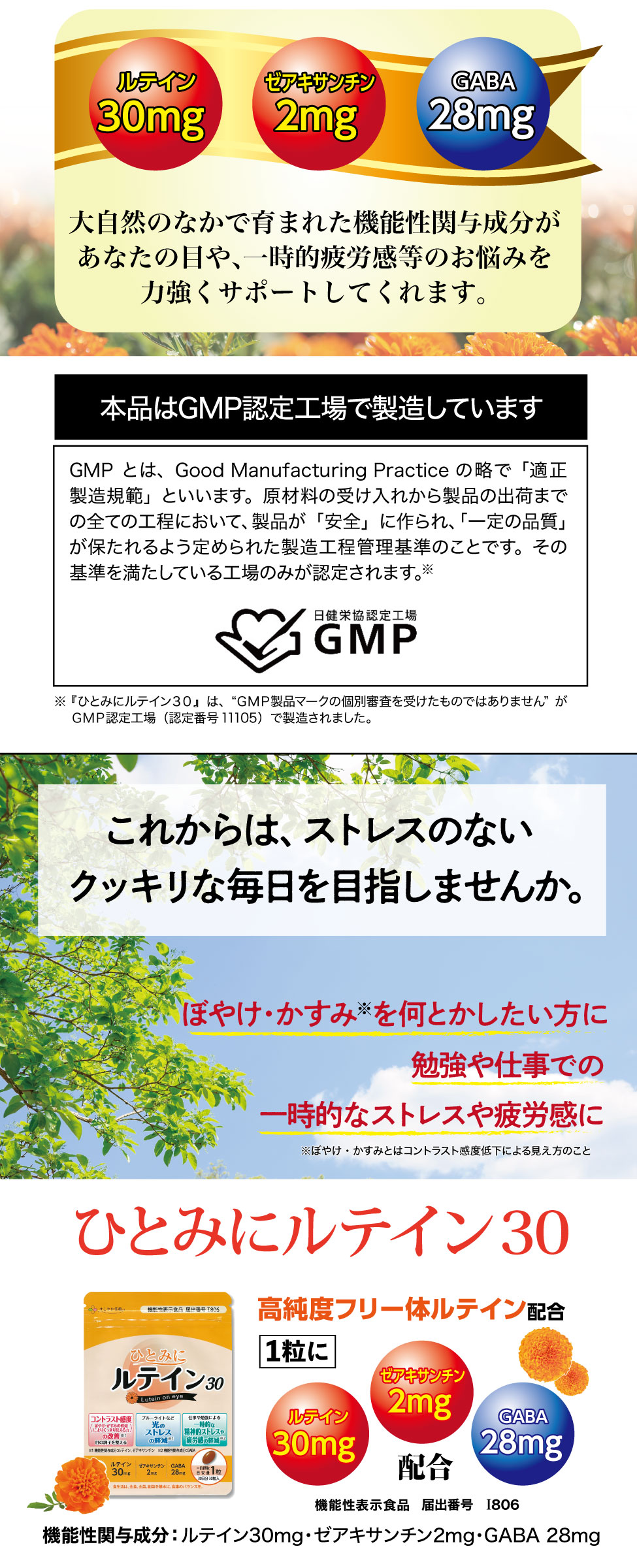 機能性関与成分:ルテイン30mg、ゼアキサンチン2mg、GABA28mg/1日目安1粒当たり