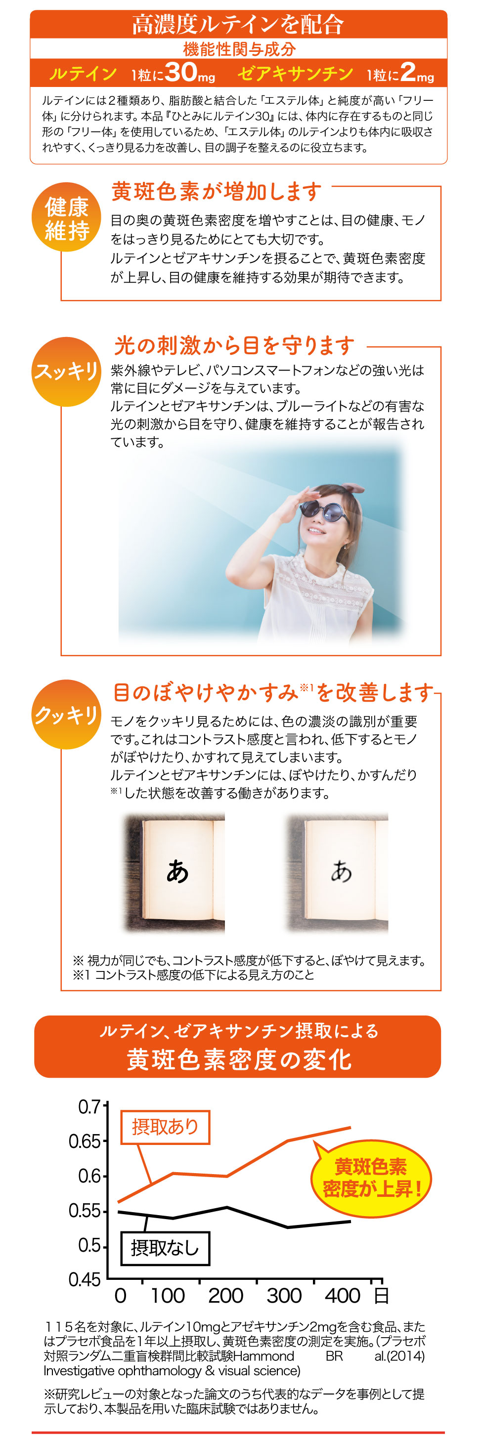届出表示: 本品にはルテイン、ゼアキサンチンとGABAが含まれます。ルテイン、ゼアキサンチンには、目の黄斑部の色素密度の増加によるブルーライトなどの光のストレスの軽減、コントラスト感度(ぼやけ・かすみの軽減によりくっきり見る力)を改善し、目の調子を整えることが報告されています。GABAには、仕事や勉強による一時的な精神的ストレスや疲労感を軽減する機能があることが報告されています。